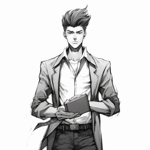 male anime character handrawn in the style of Yusuke Murata. Male, full body, cropped hair and beard. Holding a grimoire. One punch man manga style. Yusuke Murata. --s 750 --v 5.1
