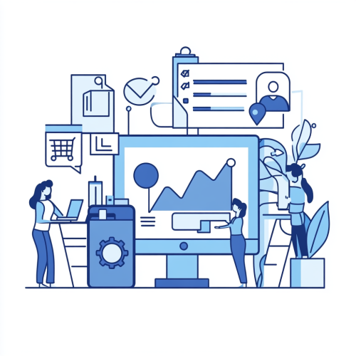 Illustration vectorielle d'une équipe de support technique, avec des icônes d’assistance et de conseils marketing, arrière-plan simplifié, le tout sur un fond blanc épuré, couleurs bleu foncé #2f455c et bleu clair #61caf9, style vectoriel dynamique et minimaliste --ar 1:1 --v 6.1