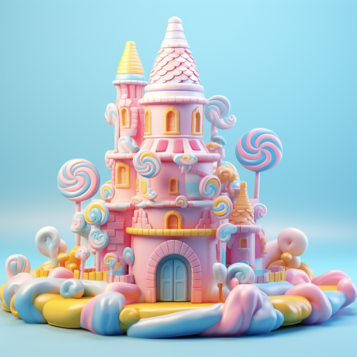 ceramic candyland castle, marshmallow swirl, pink, blue, yellow, white background, 3d render