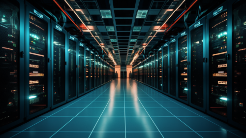 Eye level magazine style photo of data center captured on Cinestill 800T using a Sony A7R IV for a dramatic effect --ar 16:9 --s 50 --v 5.2 --style raw