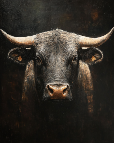 Rembrandt's painting depicting front view our subject looks down at us, portrait of a massive bull towering over us with a strong jaw, looking serious but relaxed, very realistic image and dramatic lighting deep blacks --ar 4:5