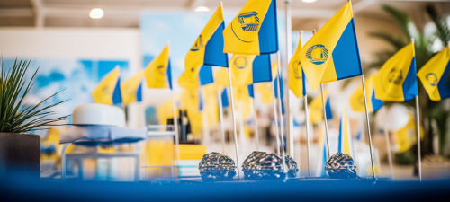 photo at convention with display products, yellow, blue and white beach flags, roll-ups, banners, display tents, with sport team logos, sport team themed out of focus in the background, depth of field