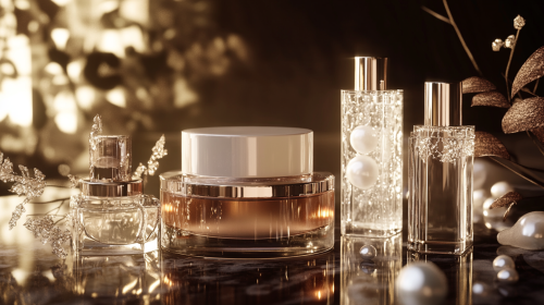 Extravagant beauty products, crystal bottles, pearl-infused creams, rich mahogany display, soft glowing ambiance, photorealistic textures, premium quality --ar 16:9 --s 50