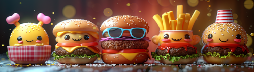 Illustrate a cheerful burger and french fries cartoon characters set, each showcasing different joyful expressions and adorned with playful accessories like sunglasses, hats, scarves, and bows. The burger features layers of cheese, lettuce, tomato, topped with sesame seeds, while the fries are sprinkled with ketchup and salt. Position them against a solid background color that complements their vibrant outfits, with the scene captured from a close-up, slightly tilted angle for a dynamic feel. Emphasize a flat, minimalistic style for simplicity and clarity. --ar 7:2 --v 6.0 --style raw --s 750