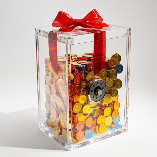 a very huge massive crystal clear themed safe that is empty with a locking dial on it with a large red bow draped over it like a present- in the theme of modern and minimal with a layer of bright yellow coins inside under a differentiated layer of bright blue coins with a white background