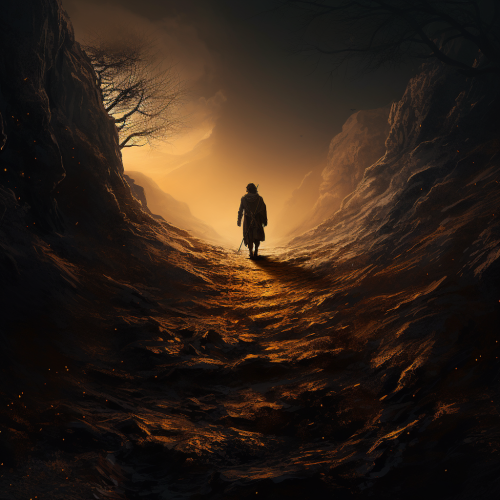 he had walked for a long time and hadn't met anyone in weeks. up ahead on a hill there was cave with an ancient treasure guarded by a formidable enemy