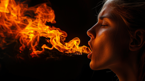 Close-up profile portrait of a woman facing a clean vertical column of fire. She looks angry. Clean black background --ar 16:9 --style raw