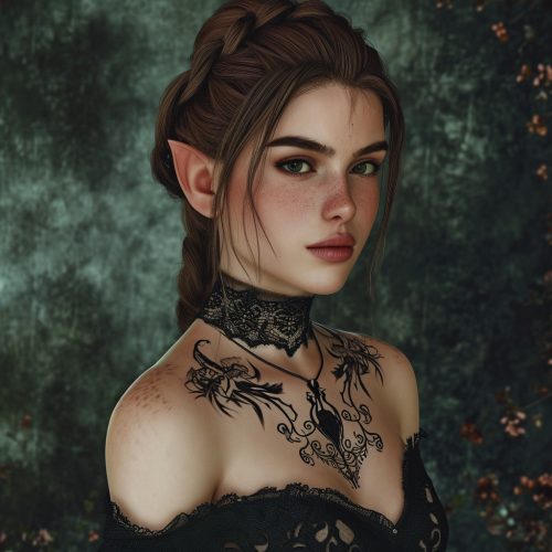 a brunette half elf, ordinary looking, with a large black and white outline of a flamingo tattoo on neck and chest. --v 6.0