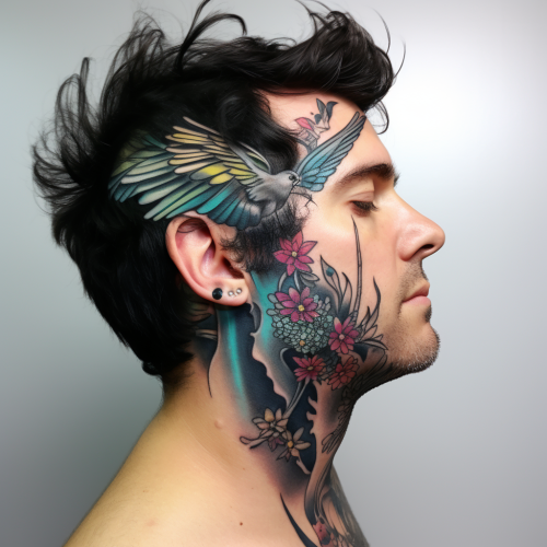 a female half elf with brown hair and a black and white tattoo of a flamingo on her neck and chest --v 6.0