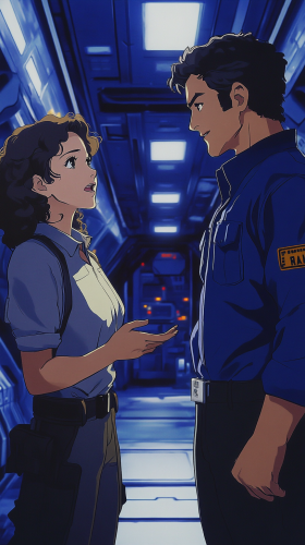 Ellen Ripley standing in a starship corridor while speaking to a handsome Asian male Federal Marshal wearing a blue jacket and badge, anime cel, --ar 9:16