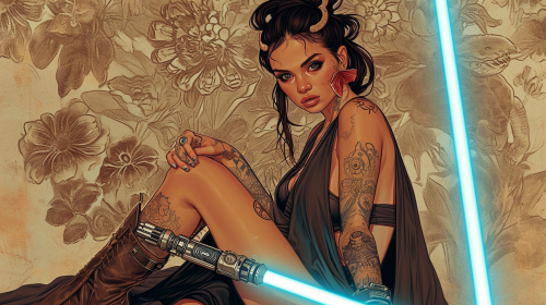 Doug Chiang inspired, Jedi, rockabilly with long hair tied into a bun with a thin red metallic circlet on her head, Star Wars style tattoo up her leg from her ankle to her thigh, tomboy, hyper-feminine, pronounced feminine features, pronounced chest, short Jedi robe above the knee, boots halter top beautiful face, an ignited blue lightsaber with ornate silver hilt sits on her lap, Asimov book cover as a tarot card black and gold --ar 16:9 --v 6.0
