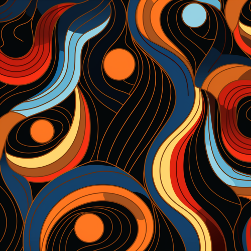 70s abstract retro patterns against a black background using blue, red orange and tan