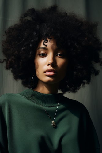 the woman in the gray sweatshirt has black eyes that look like earrings, in the style of afro-caribbean influence, dark amber and green, yosuke ueno, photo taken with provia, dinocore, classic americana, august von pettenkofen --ar 2:3