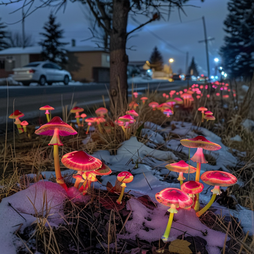 Hyperrealistic Psilocybin Magic Mushrooms growing in the streets of Lethbridge Alberta Canada, glow, high resolution, high quality image