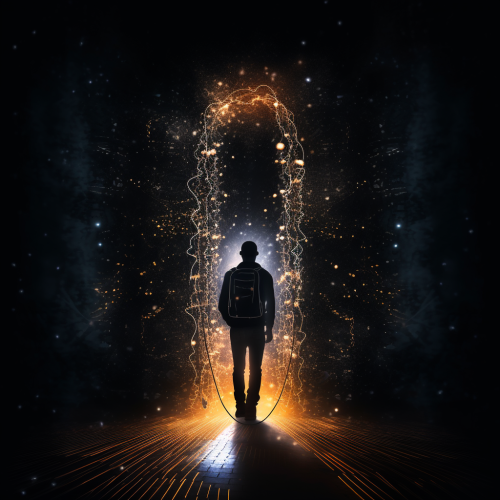 chalk drawing of a silhouette wearing headphones walking up to a big microphone dark background with shining light 1280px by 720px 16:9 aspect ratio