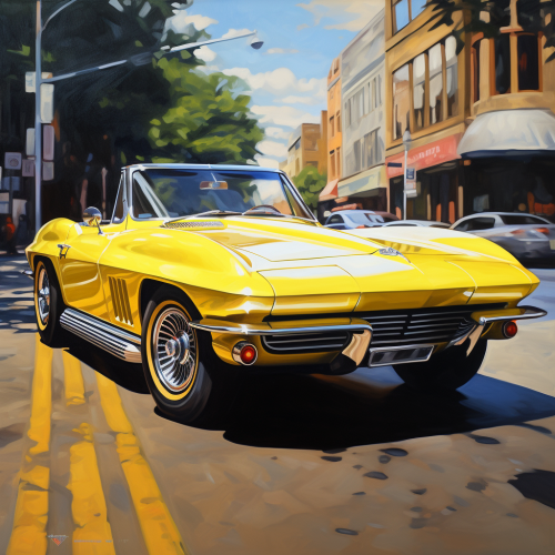 a painting of a 1965 convertible corvette, canary yellow, it should embrace masculinity and represent a time adventure