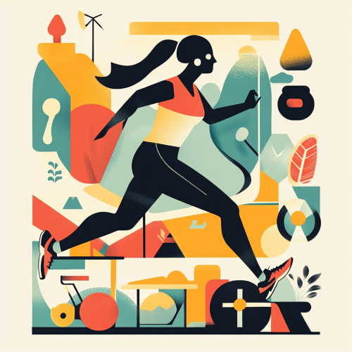 A person cycling through different workout activities--running, lifting weights, stretching, and meditating--seamlessly blending together in one image, representing a balanced exercise routine for stress relief.