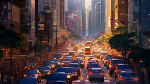 an image of a city with lots of streetcars andtaxis, in the style of tilt - shift lenses, mesmerizingopticalillusions 8k, atmospheric cityscapes , photographically detailed portraitures --ar 16:9 --v 5.0