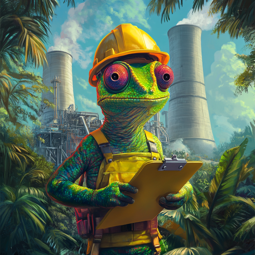 a bright, colorful, vibrant, photo-realistic chameleon, wearing a yellow hard hat holding a clip board, with a nuclear power plant with really short, fat cooling towers, that's been built in a lush, tropical forest behind him