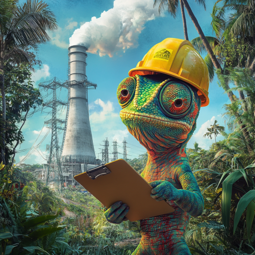 a bright, colorful, vibrant, photo-realistic chameleon, wearing a yellow hard hat holding a clip board, with the drax nuclear power plant with the cooling towers, that's been built in a lush, tropical forest behind him