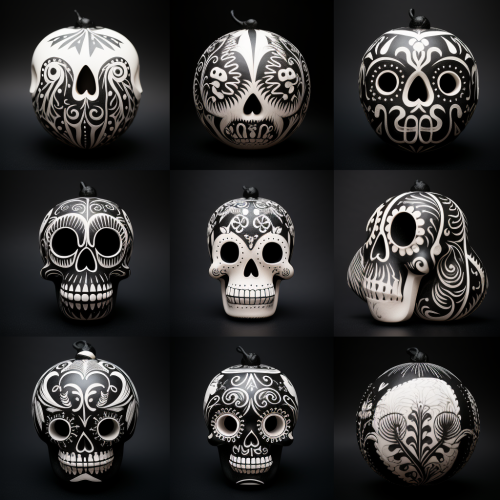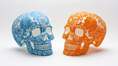 Minimalist calavera (sugar skull) featuring delicate, linear floral patterns, influenced by papel picado (cut-paper art), with only hints of color in traditional DÃa de los Muertos shades (marigold orange, cerulean blue) --ar 16:9 --v 6.1
