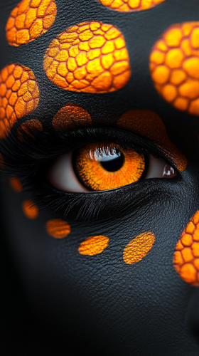 vibrant gold and darkest black, scaled skin, dia de los muertos, sugar skull makeup, Professional Macro Photography::4 detailed, extreme close-up, sharp focus, dreamy light, Canon EOS R5, f/6.3 aperture, 1/400 second shutter speed, ISO 100, high-quality, award-winning, whimsical environment, attention to detail::3 blurry, dim, generic, plain, grainy::-2 --ar 9:16 --style raw --personalize rubitiw --stylize 500 --v 6.1