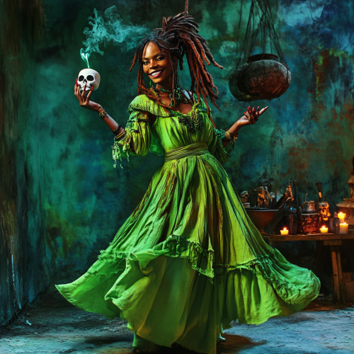 black voodoo witch holding sugar skull and grinning, wearing bright green dress, dreadlocks, new Orleans, candles floating, hoodoo potion shop, full body shot head to toe, dynamic, cinematic, in the style of seinen, green glow, ethereal