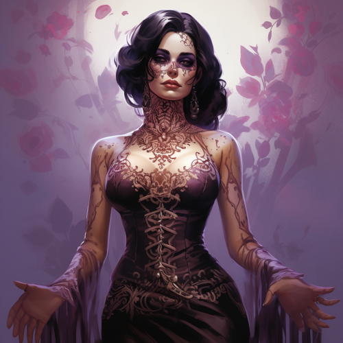 full body portrait of a female supervillain, she is dressed as a sugar skull, appropriate dress, black hair, purple hues, full body image, esad ribic comic book style