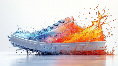 Holochromatic paint splashing in mid air forming an Shuja sneaker Luminescent, Quasar Elegance, celestial glam, iridescent, Dutch angle shoe, hyper realistic, paint dripping, hyper detailed white studio background --ar 16:9 --s 750