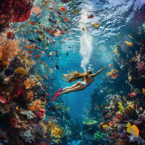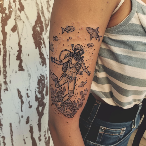 design a feminine tattoo for the upper arm that has a diver and all sort of different tropical fish around the diver while diving in corals