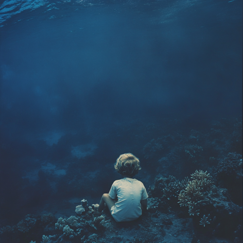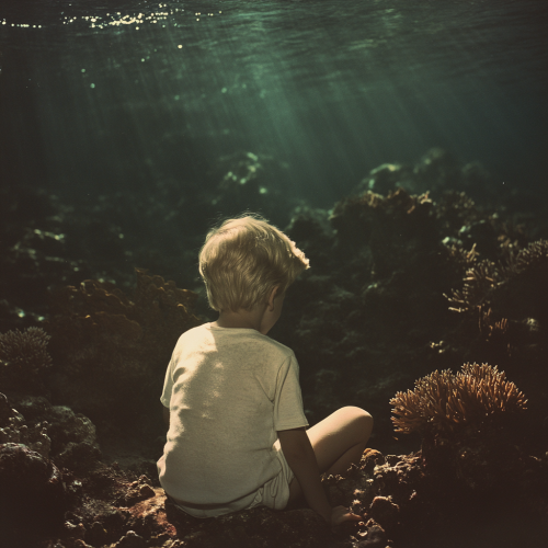 wolfgang tillmans photograph, child sitting at bottom of the ocean, looking down, coral reefs, indistinct features, soft lighting, melancholy, soft divine lighting, post punk aesthetic, surreal, dreamy, maximalist, very busy composition