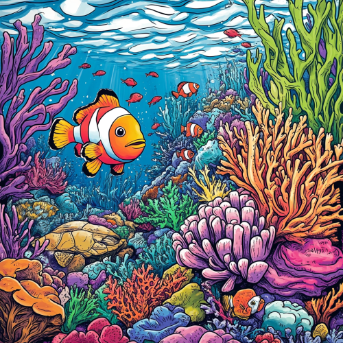 The central illustration depicts a vibrant coral reef scene. A colorful clownfish is swimming near an anemone, surrounded by a diverse array of coral and other small reef fish like butterflyfish, damselfish, and a sea turtle in the background. The reef is filled with intricate details, such as branching corals, seaweed, starfish, and small, hidden marine creatures (like shrimp or seahorses) to make the page more engaging and challenging to color. - Fishdom mobile game style