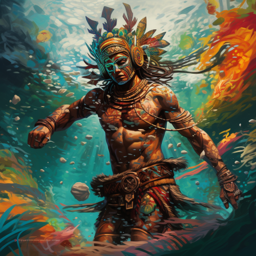 Aztec warrior swimming underwater with vibrant colors around a coral reef