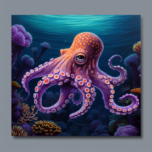 bright purple octopus with orange spots swimming in sea by colorful coral reef