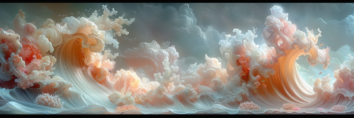 art by jeeyoung lee, the scene with soft blue waves, white reef wave, white clouds and coral as the main elements, the background is soft white, in the style of realistic and hyper-detailed renderings, rococo pastel colors, beige, light crimson and sky-blue, nature-inspired pieces --ar 3:1 --stylize 750 --v 6.0