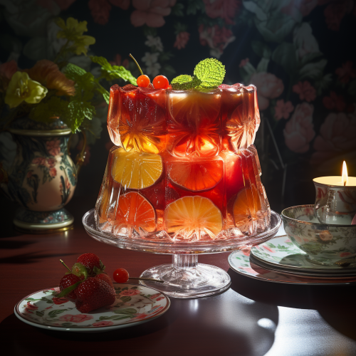a blonde woman with a fringe trips on LSD, at 70s dinner party food, surreal 70s hotdog elefants, sausage retro jello salad, 50s food , hyperreal photography --s 250 --v 5.2 -