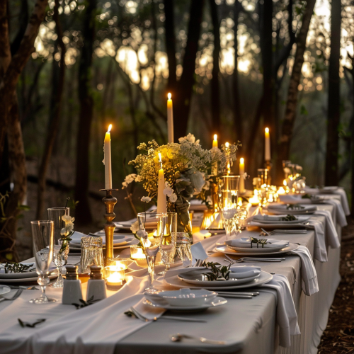 Woodland Dining Venue in Evening Light – A beautifully decorated long dinner table set outdoors in a forest. Elegant linens, stylish tableware, soft candlelight, surrounded by trees. Gentle, warm lighting adds a magical ambiance. Ideal for a corporate gathering. --v 6.0 --s 50