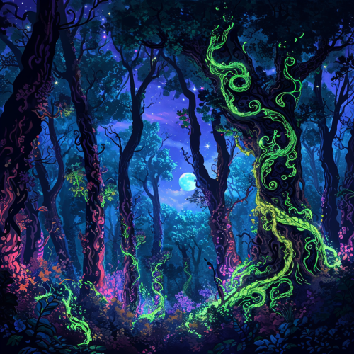 Create an exceptionally vivid and high-quality artwork for a psychedelic trance party, with a theme centered around a 'Geometric Dark Psychedelic Forest'. The scene unfolds in an ethereal, dense forest at twilight, where reality blends with a surreal, otherworldly essence. The trees are towering and labyrinthine, with their trunks and branches forming complex geometric patterns and shapes, like living fractals. These trees are imbued with glowing neon colors - vibrant purples, electric blues, and vivid greens, adding a hypnotic and mystical atmosphere. Incorporate a kaleidoscopic sky that transitions from twilight blues to deep cosmic blacks, dotted with constellations that form intricate geometric shapes, resonating with the theme of the artwork. The forest floor should be a mosaic of glowing, bioluminescent flora - ferns, flowers, and fungi, each radiating light and color, creating a carpet of natural psychedelic art. Embellish the scene with floating geometric shapes, like glowing orbs, spirals, and tetrahedrons, weaving through the trees, as if they are alive and dancing to the rhythm of psytrance music. These elements should add a dynamic and mesmerizing quality to the artwork, inviting the viewer to step into a world where nature and geometry converge in a spectacular display of psychedelic beauty. The overall composition should be both harmonious and striking, a visual symphony that captures the spirit of a dark psychedelic forest for a psytrance party, - realistic, sharp details, Canon EOS R5 Lens: Wide - angle 24 - 70mm lens Settings: Aperture f/ 8, Shutter Speed 1/ 250s, ISO 200 --ar 2:3 --v 5.2