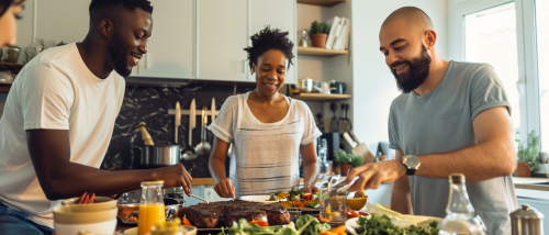 two men and one woman staning on a kitchen table where they have been preparing a dinner party. One the left is a black man in his thirties, wearing a white t-shirt and jeans. HJe works in tech. In the middle is an Asian 30-year old woman. On the right is a white man in his thirties, kind of a hipster with a mustache. They are in the kitchen of a Paris apartment and are waiting for their friends to join. the atmosphere is minimal, classy but also cool, warm and friendly. The meals in front of them consist of vegetable dishes, seafood and a steak - presented family style. In the style of 35mm film. Vintage pastel mood. --ar 21:9 --style raw --v 6.0