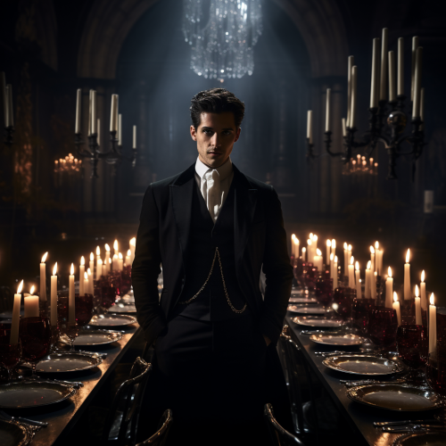 a man standing in the in the background. in front of him a long dinner table filled with candles. The table is dark brown. The room is dark lit by candles. The man is wearing a glamorous black outfit. Holding a magical torch