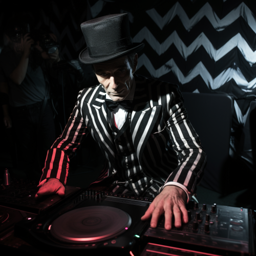 luxury club in cartoon with a dj in the far back, interior photo, vibrant colors