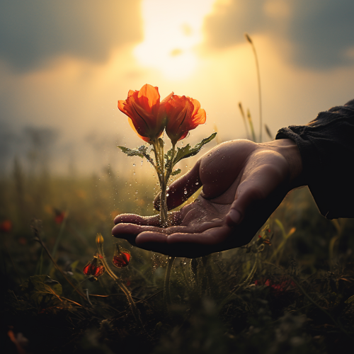 8k, high resolution, spectacular quality, very detailed, vibrant colors , Hands come out from a brunch field, holding a flower, in a foggy day, cinematic, nature background, photorealistic, dreamy feeling, decadent atmosphere, dramatic colors