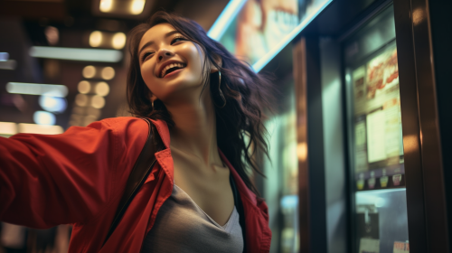 Generate a hyper-realistic image of an asian indian Australian Gen Z teenager working at the drive-through of Carl's Jr. The most prominent and essential detail is their uniform: a vibrant red short-sleeve shirt that is unmistakably paired with a contrasting black collar. This combination should be the primary focus. Alongside this, they wear a warm smile, showcasing their friendly demeanor as a staff member. --s 750