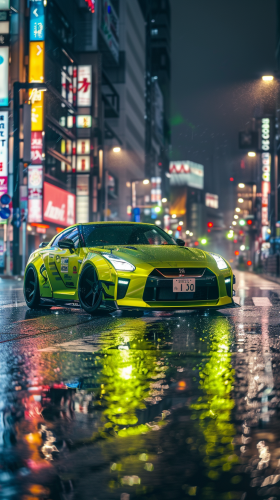 Nissan GTR R35 front side viwe,Custom widebody, lime green metallic,black wheels,JDM style decals on a wet street in downtown Tokyo at night --ar 9:16 --v 6.0