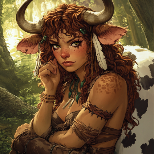 beautiful giant female firbolg forest loving Barbarian, brown curly hair, tan, mediterranean skin tones, vitiligo skin, cow print fur skin, broad pink nose, long cow floppy ears, cow horns, full body illustration, cow humanoid, more human-like, barbarian,hair with feathers and bone beads, fighter from the druidic wilds, the style should be digital illustration style with bright colours and detailed linework, intricate detail, complex lighting, fantasy, dungeon and dragons character art, dynamic pose, cinematic composition, perspective, scenic background of forested hills and mountains, smooth textures, sketch style, full body, scenic forest background.