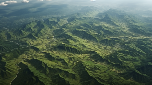 realisitc aerial view of central europe hilly countryside, carpathian hills, rolling hills, remote landscape, sharp, isometric view, --ar 16:9