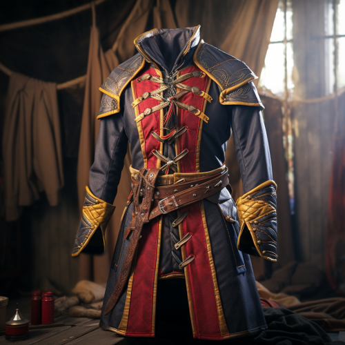 dishonored style. Pirate coat, empty, fine quality, knee length, equal red yellow blue, rope belt, medieval, sunny ship background