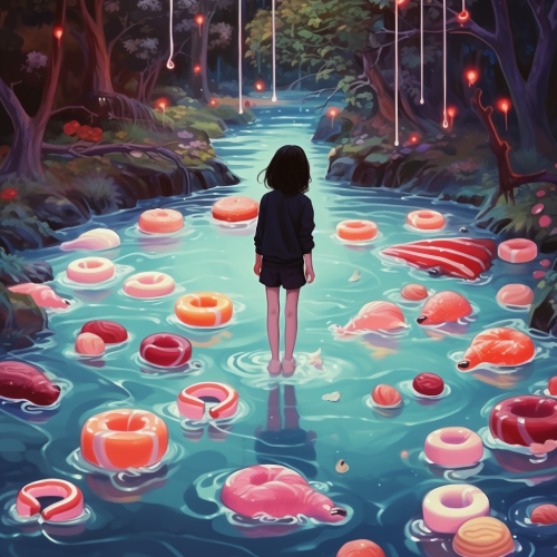 Show a person tentatively dipping their toe into the marshmallow pool, their expression a mix of apprehension and curiosity. Surround them with floating gummy candies, adding a touch of whimsy to the scene, gen z, illustration in style of studio ghibli