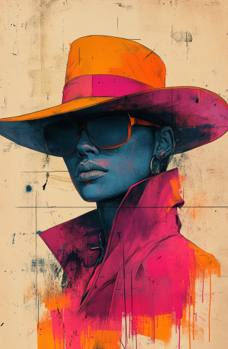 Create a vibrant pop art-style poster featuring a confident young woman with curly hair blowing bubble gum. Use bold colors like electric blue, hot pink, and neon green. The background should have a dynamic, geometric pattern with sharp contrasts. The woman's expression should be playful yet assertive, with oversized sunglasses reflecting a cityscape in vivid colors. Keep the overall style edgy, modern, and energetic. --ar 2:3