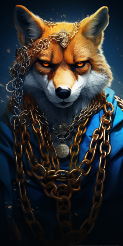 a fox with chains on his neck, in the style of hip hop aesthetics, poster art, 32k uhd, blue and amber, accurate and detailed, wildstyle, celebrity and pop culture references --ar 1:2